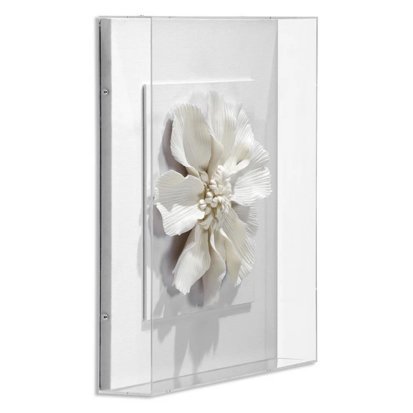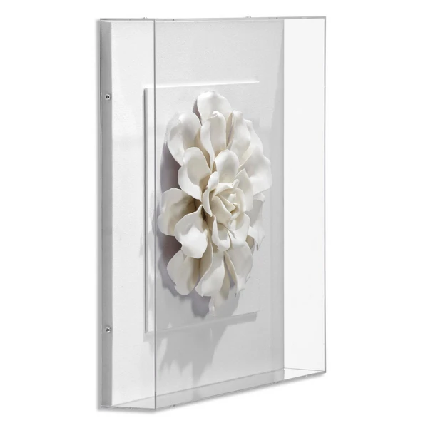 • Flower sculpture on linen backing set in an acrylic shadowbox.