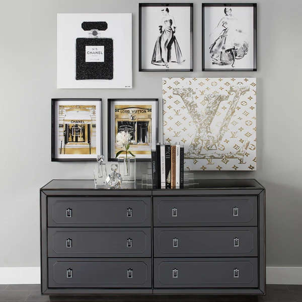 Featuring hand-applied glitter embellishments, this black-and-white image of Chanel No. 5 adds a stylish, glam note to the wall.