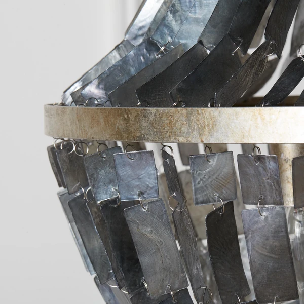 Black Mother of Pearl shell is elegantly draped over a champagne leafed metal frame creating the perfect chandelier for a sophisticated coastal space.