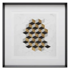 Composed of geometric shapes, this eye-catching limited-edition abstract work from Naomi McCavitt is printed on paper with hand-embellished accents. Set off with a white mat, this piece is displayed in a black frame.