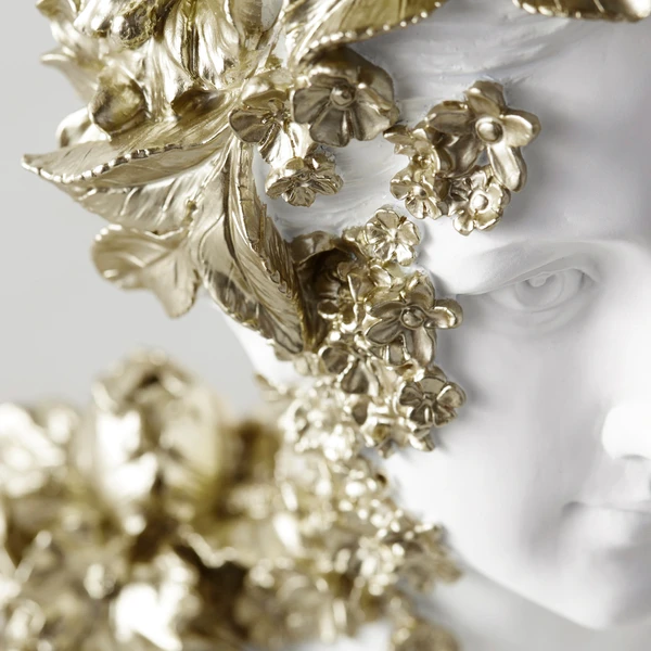A bold addition to your collection, this stately bust is intricately detailed and adorned with flower embellishments in gold.