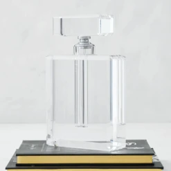 For those who love living large, our outstanding 10.5 inch tall Harlow perfume bottle is a dressing table essential. Crafted of clear, solid glass with simple beveled edges, the Harlow bottle has a removable stopper with an attached long glass stem and Silver metal fittings at the opening.