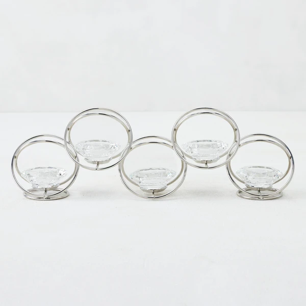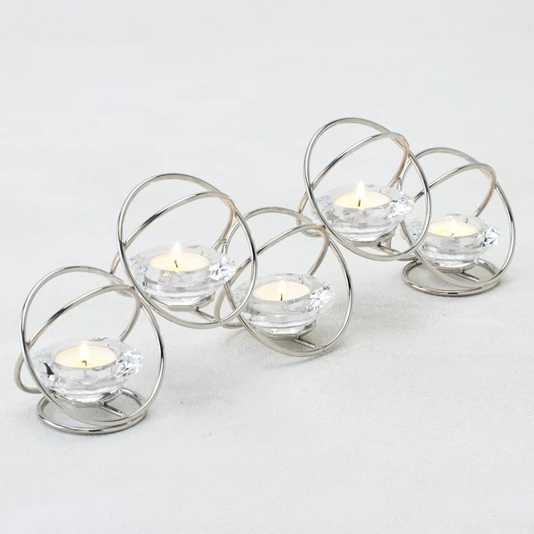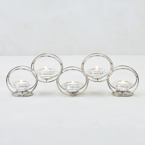 Diamond-shaped glass votive holders are encircled by linking silver rings to create a mod centerpiece that feels both dazzling and dynamic.