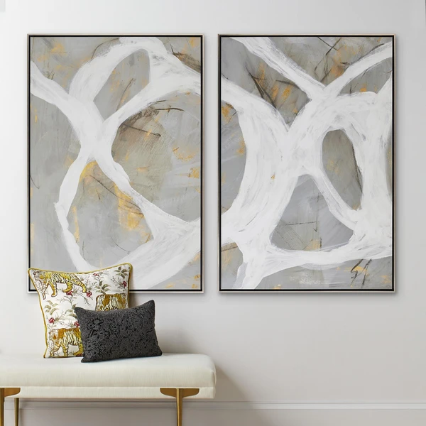 This abstract work from Barclay Butera enlivens any wall with its bold brushstrokes and hand-applied gold embellishments. Printed on canvas with an image brush gel finish for added texture, this piece is displayed in a silver floater frame.