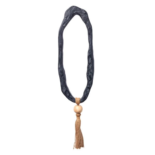 Inspired by the East, this set of three decorative hangings will add instant sophistication to any decor. These three organic, free-form resin rings will draw the eye to the expertly hand-knotted sisal rope and single natural wood bead. Soothing shades of blue, gray, and white create a feeling of calm. Generously sized, each piece is artisan crafted and each set is unique. The finish, wood grain, and exact measurements will vary.