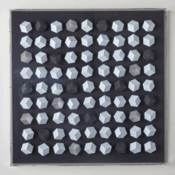Perhaps one of our most unique pieces, Movement in Squares I is destined to become a focal point in your home. Guests will be fascinated by the silver, white, and black cubes set on a fabric backing in a clear acrylic shadowbox. This wall decor will bring modern glamour and sophistication to any space. #1 in a series of 2.