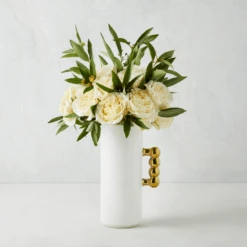 An eye-catching addition to any shelf or table. This pitcher is crafted of ceramic with a bright white finish and bauble handle in gold.