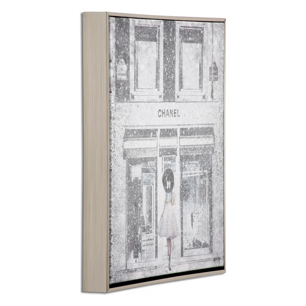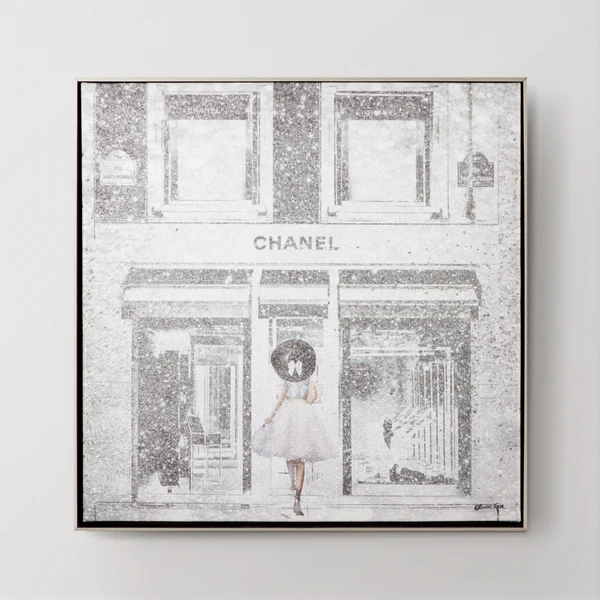 The tonal palette of this Chanel storefront print adds a stylish, sophisticated note to the wall, while glitter embellishments add a hint of sparkle. Printed on canvas, this piece is displayed in a champagne silver floater frame.