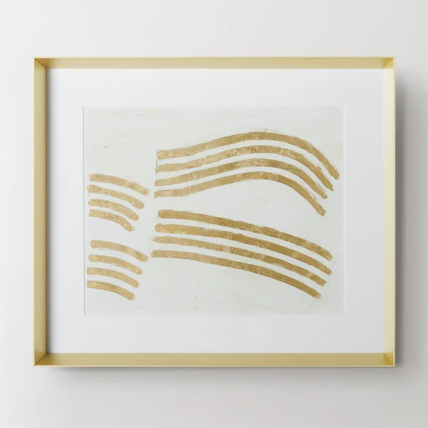 Full of energy and movement, this work from artist Melissa Wang is embellished with gold-leaf paint and a matte gel finish for gorgeous texture and shine. Printed on paper, this piece is matted and displayed under glass in a solid wood frame with a gold finish.