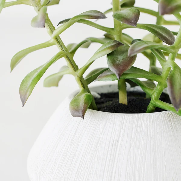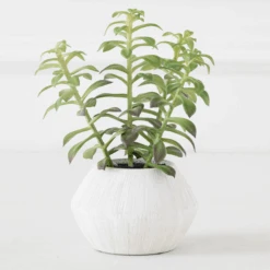 A visually stunning faux arrangement featuring tree succulents elegantly arranged in a white ceramic planter.