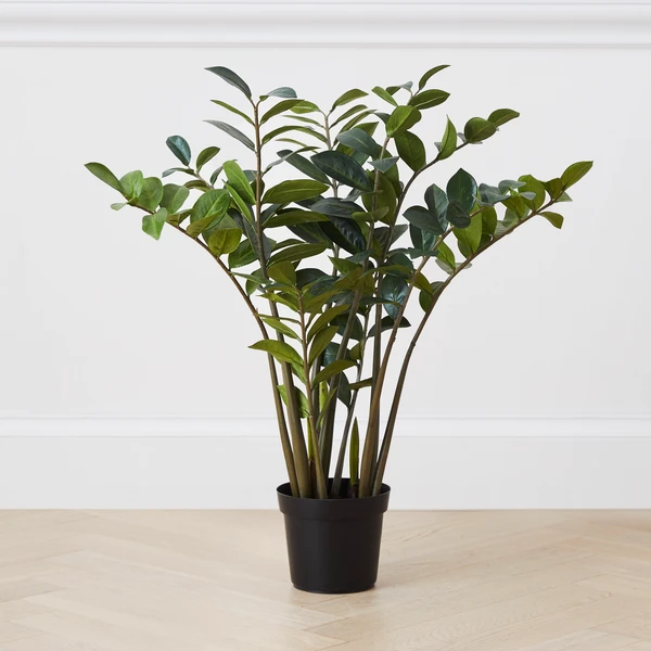Housed in a black pot, this faux-zamioculcas tree will look lush and lifelike all year long.